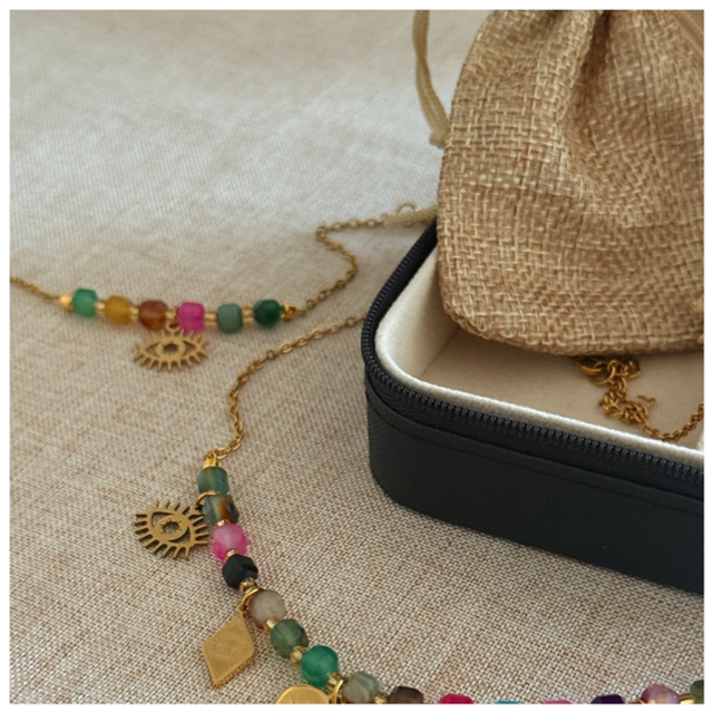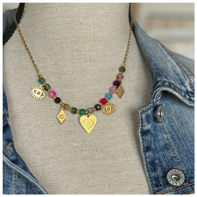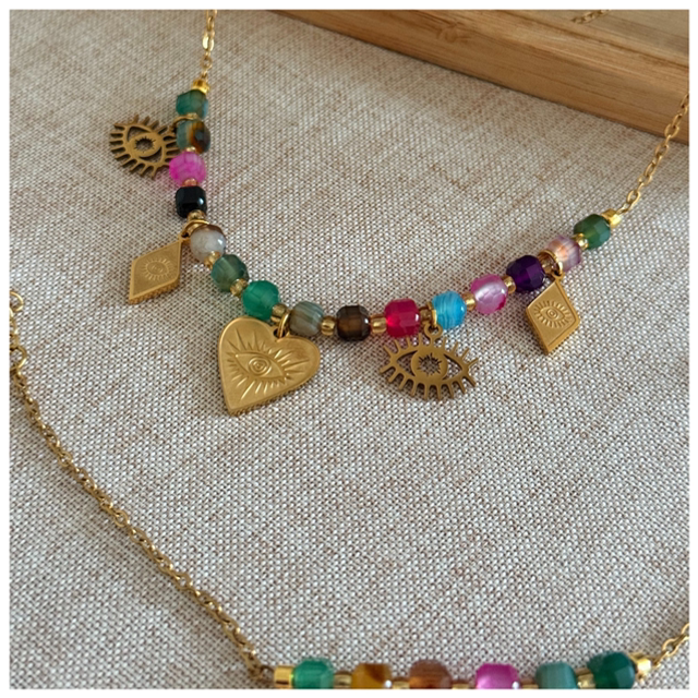 1 collier multipampille oeil protecteur , acier inoxydable et perles multicolores
