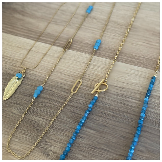 1 collier long , perles bleues et acier inoxydable, fermoir à bascule